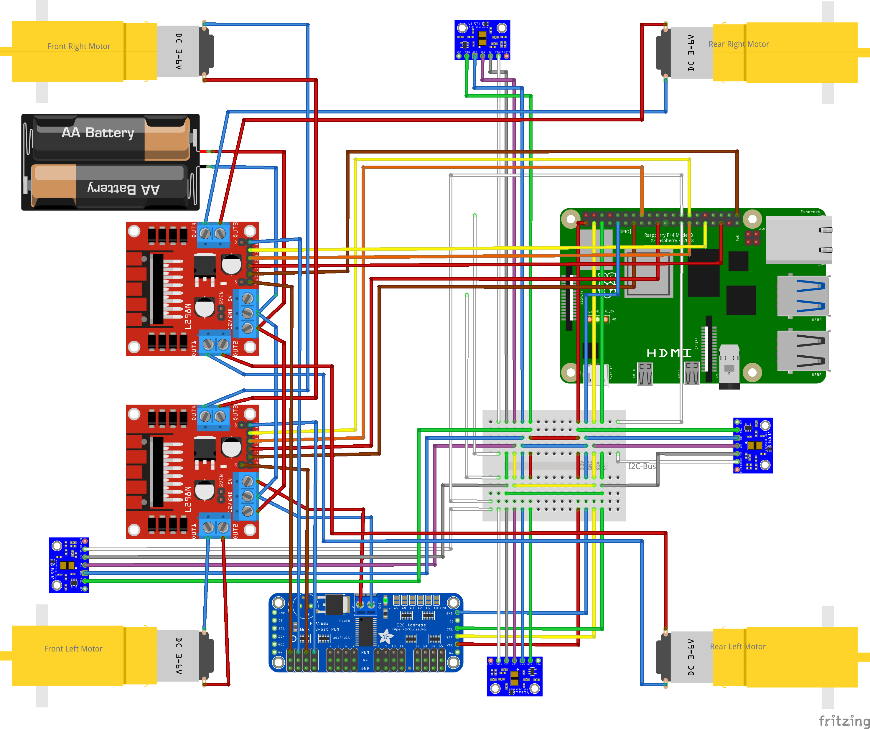 Die Geschwindigkeit wird mit den PWM-Ports des Servo-Controllers gesteuert. Der Servo-Kontroller selbst wird über den I2C-Bus des Raspberry Pi angesteuert. Den Strom für den Servo-Kontroller liefert praktischerweise einer der Motor-Treiber.