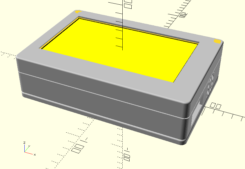 Es ist mittlerweile die dritte Version des Gehäuses entstanden. Alle Versionen haben verschiedene Schwerpunkte. Die "Programmierung" der Konstruktion ist so konzipiert, dass an zentraler Stelle die gewünschten Maße für das Gehäuse eingestellt werden und sich dann die abhängigen Maße automatisch berechnen. Auch ist es relativ einfach, ein anderes Display zu verwenden (z.B. ein 10-Zoll-Display für mehr Platz).