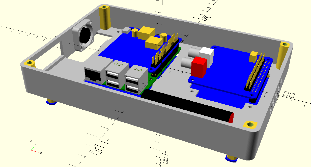 Wichtige Zahlen sollte man als "Konstanten" in eine eigene Datei auslagern und mit der include-Anweisung einbinden. Ich habe z.B. alle Maßangaben der einzelnen Baugruppen und Bauelement in separate Dateien mit dem Postfix "_Constants" ausgelagert. Darin sind dann unter anderem für den Raspberry Pi die Breite, Tiefe und Höhe definiert, aber auch Bohrloch-Abstand und Bohrloch-Durchmesser.