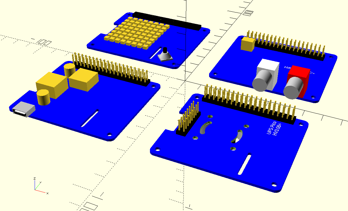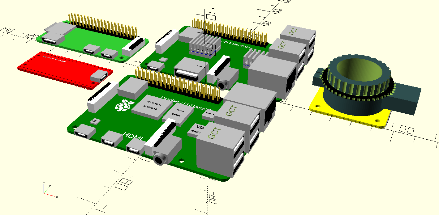 Aus diesem Grund habe ich von allen verwendeten Baugruppen und Bauteilen mehr oder weniger detailierte Modelle erstellt. Diese können dann bei der Konstruktion verwendet werden, um den Platzbedarf zu bestimmen. Das Bild auf der rechten Seite zeigt z.B. die bisher entstanden Raspberry Pi Modelle.