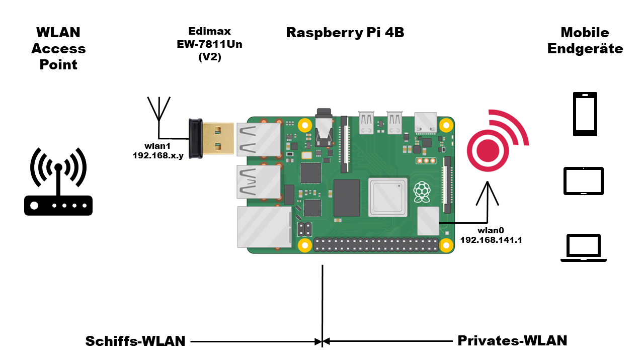 Der Onboard WLAN-Adapter arbeitet als Access Point für die Geräte mit einem privaten IP-Address-Bereich. Ein zweiter WLAN-Adapter wird in einen der USB-Ports gesteckt und stellt die Verbindung zum gesicherten WLAN des Zeltplatzes/Schiffes her. Und jetzt noch ein Bild: